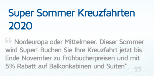 Der Sommer 2020 wird ganz bestimmt „euer“ Sommer: Bei Logitravel spart ihr noch wenige Tage ingesamt 5% als Sofortrabatt auf Balkonkabinen und Suiten auf vielen Kreuzfahrten in der Nordsee & Mittelmeer. Der 5%-Rabatt zudem auch mit den aktuellen Frühbucherrabatten kombiniert werden.