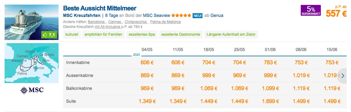 Der Balkon- und Suitenrabatt kann auf Kreuzfahrten nach Nordeuropa sowie im Westlichen Mittelmeer und im Östlichen Mittelmeer im Zeitraum 1. Mai 2020 und 31. Oktober 2020 genutzt werden. Die Mindestdauer der Kreuzfahrt muss 7 Nächte betragen, um den Rabatt zu erhalten.