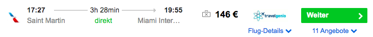 Für ca. 150€ Oneway gibt es ab St. Maarten regelmässige Flüge nach Miami bzw. Ft. Lauderdale (ca. 40km von Miami entfernt).