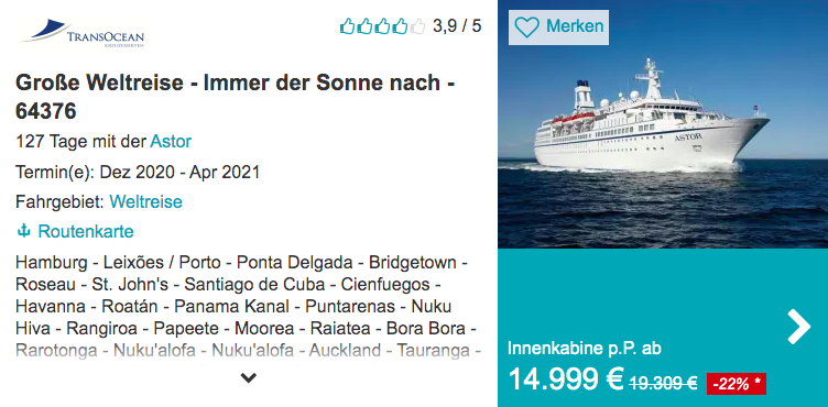 Wie TransOcean Kreuzfahrten erklärt hat, wollen Sie ihrer Astor noch einen gebührenden Abschied bereiten. Dazu gehört im Winter 2020/2021 eine insgesamt 128 Tage dauernde Weltreise inkl. Umrundung der Erde von & nach Hamburg.