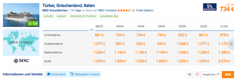 Auch wenn Triest der bevorzugte Einschiffungshafen ist, kann die MSC Fantasia auch mit Ein- und Ausschiffung in Istanbul bzw. Piräus gebucht werden. Sichert euch am besten gleich entsprechende Frühbucherangebote und bucht noch heute eure Sommerkreuzfahrt für 2021!