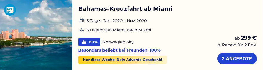 Das tolle an der Aktion ist, dass auch viele günstige Kreuzfahrten inklusive 100€ Bordguthaben buchbar sind – z.B. ab Miami 5 Tage auf die Bahamas inkl. Vollpension ab 299€ pro Person (+ 100€ Bordguthaben)
