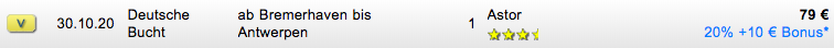 Reiseroute der Kreuzfahrt: Bremerhaven – Antwerpen am 30.10.2020 – 31.10.2020